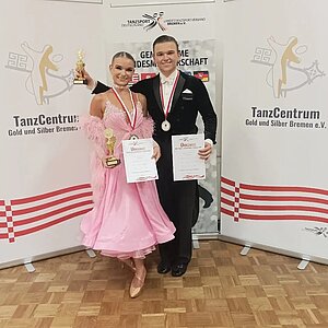 Im Turnier der Jugend B-Standard erreichten die Beiden souverän das Finale und standen am Ende im Gesamtklassement ganz oben auf dem Treppchen und sind somit auch Bremer Landesmeister 🏆🥇Mit diesem Sieg stiegen Julian und Janina in die Jugend A-Standard auf. Hier tanzten die Zwei dann auch gleich mit und erreichten den dritten Platz und den Vizelandesmeistertitel Bremen 🥈