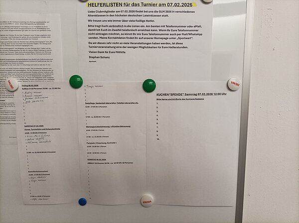 Die Trainer möchte ich bitten, in ihren jeweiligen Gruppen auf die Listen aufmerksam zu machen, damit wir genügend Helfer für diese Veranstaltung haben.